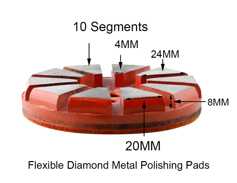 3-Zoll-10-Segment-Metallboden-Schleifscheibe, Metallbindungsdiamanten haben eine hohe Festigkeit, eine ausgezeichnete Verschleißfestigkeit und einen niedrigen Reibungskoeffizienten. Metallbindungsdiamanten mit hoher Schleifleistung und geringer Schleifkraft erzeugen beim Schleifen weniger Wärme.