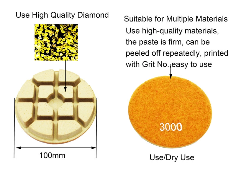 Bodenpolierkissen für Betonfußbodenhersteller Nasse Polierkissen sind selbstklebend auf dem Haken- und Schleifenrücken-Schleifkissen und eignen sich zum Schleifen von Stein, Erdfliesen, Keramik.