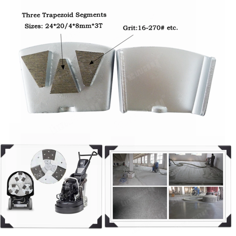 Das Folgende sind normale Spezifikationen Drei Segmente HTC Diamantschleifschuhe für die Terrazzobodensanierung von Beton: