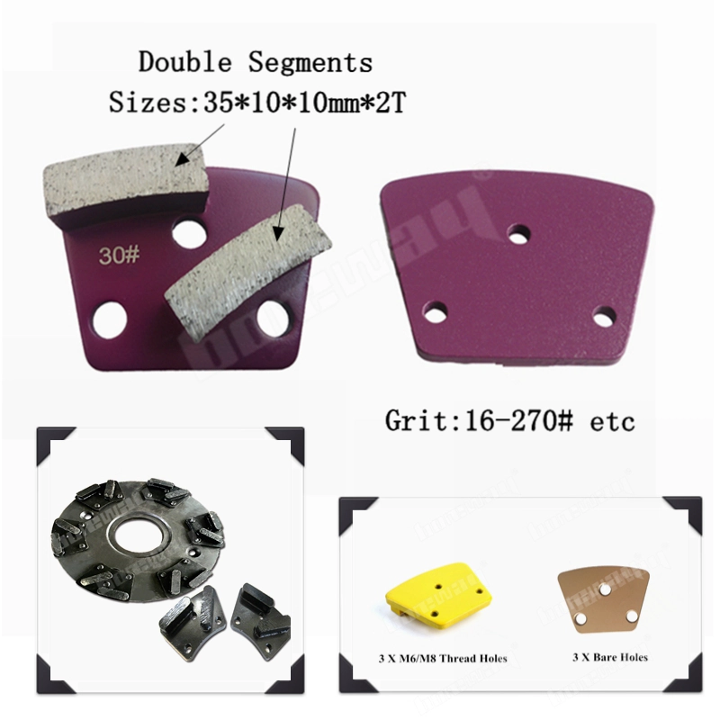 Ce qui suit sont des spécifications normales Deux segments M6 M8 trouent des plaquettes de meulage diamant trapézoïdales pour plancher en béton: