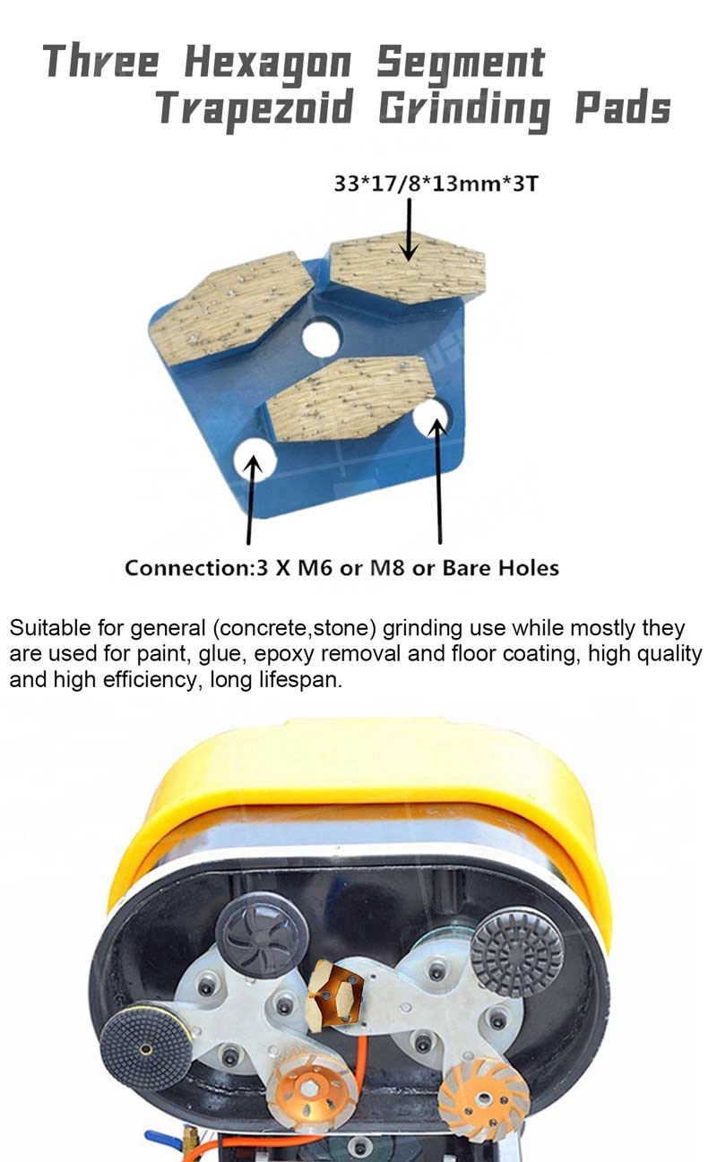 तीन हेक्सागोन सेगमेंट ट्रेपेज़ॉइड कंक्रीट मेटल बॉन्ड ग्राइंडिंग पैड टूल्स फॉर क्विक कनेक्टिंग ग्राइंडिंग मशीन सप्लायर