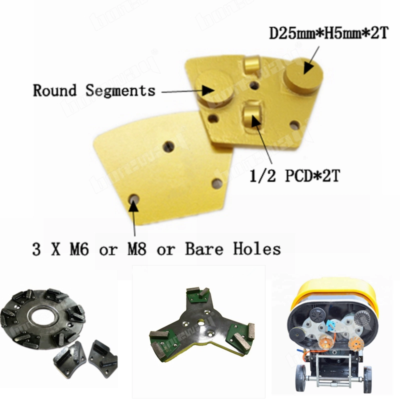 डायमंड ब्लैंक PCD पीस जूते। सभी प्रकार के कोटिंग्स जैसे पेंट, वार्निश, गोंद, एपॉक्सी, ऐक्रेलिक, खराब अवशेष, वीसीटी मैस्टिक, ब्लैक टार चिपकने के साथ-साथ कंक्रीट फर्श पर मोटी रबर सामग्री को हटाने के लिए उपयोग किया जाता है।