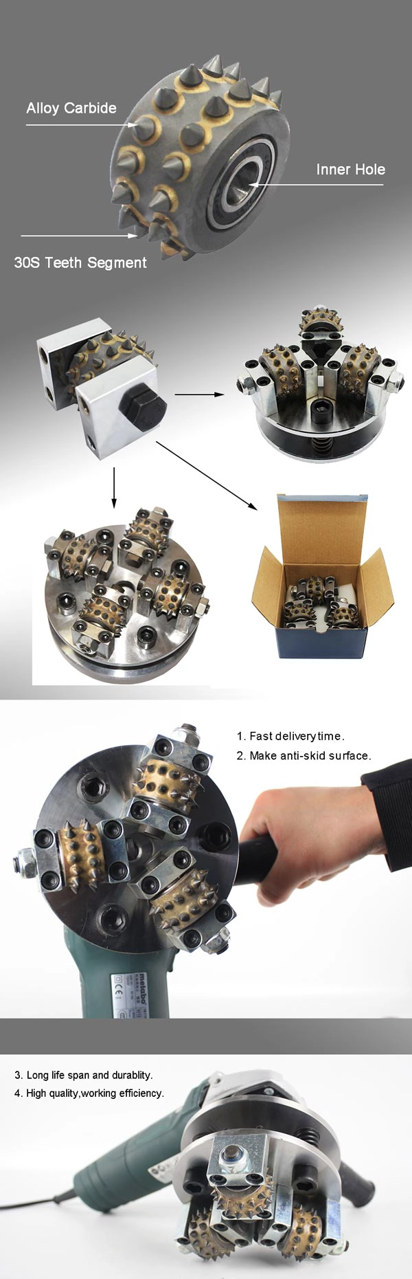 30s Lega Carburo cespuglio Martello Rulli Litchi Superficie Rettifica Utensili Fof Calcestruzzo Fornitori: Il rullo Bush Hammer 30S con supporto viene utilizzato per la fabbricazione di superfici, la realizzazione di effetti bocciardati per i prodotti in pietra, la rimozione di rivestimenti o strutture in cemento, in modo efficace per creare un profilo antiscivolo adatto sia per ambienti interni che esterni. Sono anche usati come design elemento per creare un profilo proprio come la superficie Litchi.