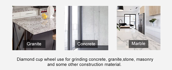 Ruota a tazza con retro in alluminio diamantato viene utilizzato principalmente per smussatura, livellamento, smerigliatura ruvida e levigatura fine di bordi in pietra, superfici e superfici curve. Il modello di utilità presenta i vantaggi di un uso conveniente, un'elevata efficienza di rettifica ed è uno strumento efficace per molare, tagliare e modellare rapidamente cemento, pietra e materiali lapidei, che vengono solitamente utilizzati su utensili elettrici o pneumatici a mano.