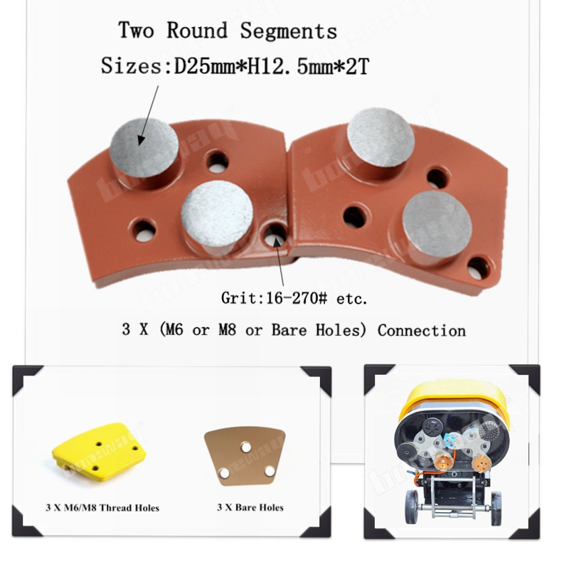 2つのラウンドセグメント研削靴。 一般的に(コンクリート、石)研削用途に適していますが、ほとんどが塗料、接着剤、エポキシ除去および床コーティング、高品質および高効率、長寿命に使用されます。