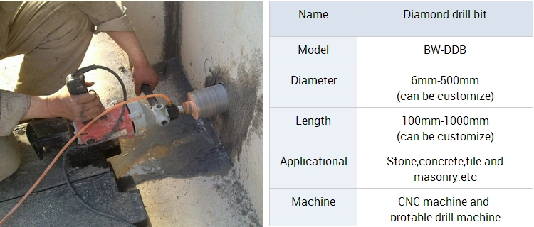 これらのダイヤモンドドリルビットは、通常、ダイヤモンドドリルビットはCNCマシンとprotableドリルマシンで使用されている石、コンクリート、タイル、石工などに使用され、各中心は水穴ドリルはチップと冷却を助長している有するため、長いを持っています耐用年数。