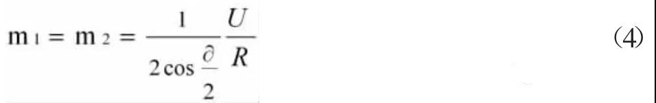 If the correction amount m of the unbalanced mass M is decomposed into two symmetrical components m1 and m2, the angle between them is α, as shown in Figure 3. The unbalance produced by M is U, and the equivalent components m1 and m2 are: